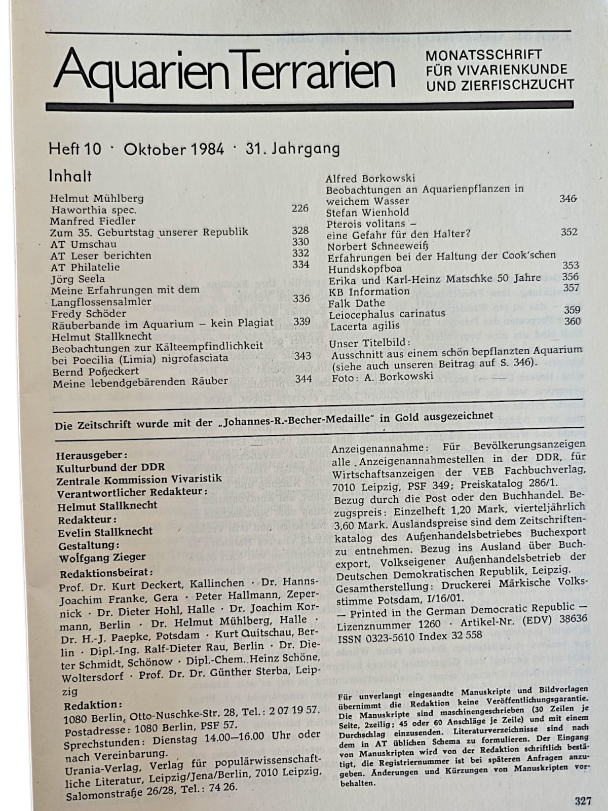 Inhaltsverzeichnis der Monatszeitschrift für Vivarienkunde und Zierfischzucht 10|84