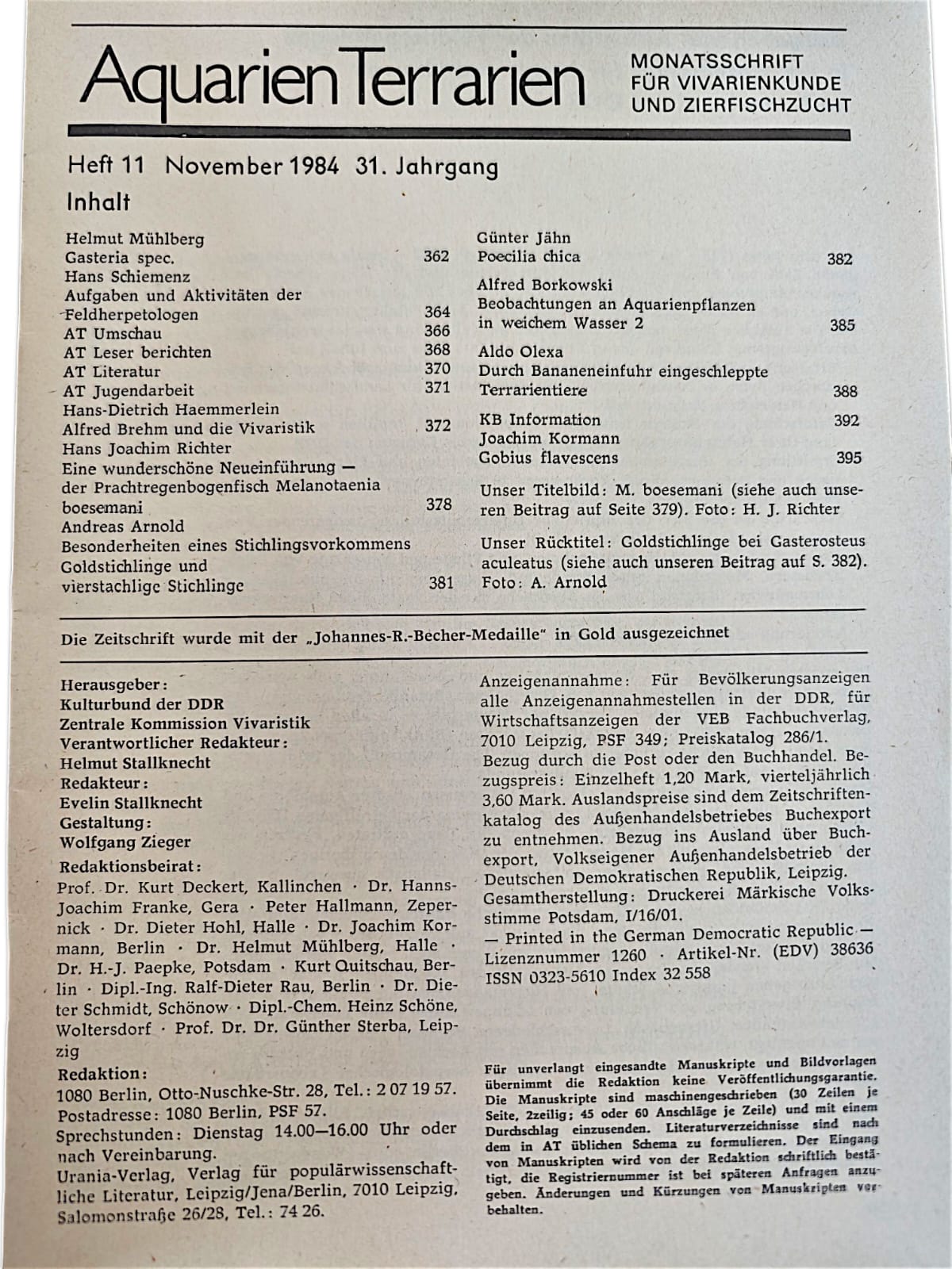 Besonderheiten eines Stichlingsvorkommens des Goldstichlings sund vierstachligen Stichlings werden dokumentiert und ein noch wenig bekannter lebendgebärender Zierfisch (heute nicht mehr verfügbar) wird vorgestellt. Der Poecilia chica.