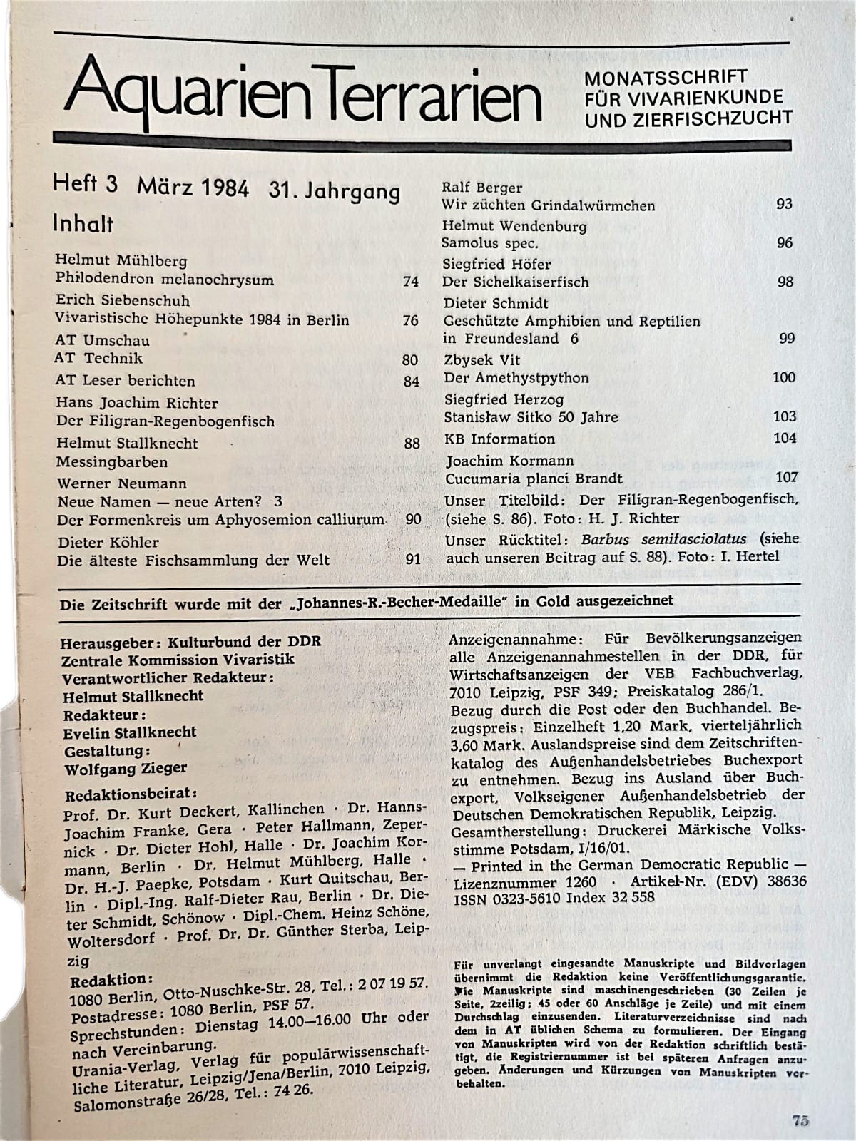 Inhaltsverzeichnis der Monatszeitschrift für Vivarienkunde und Zierfischzucht 3|84