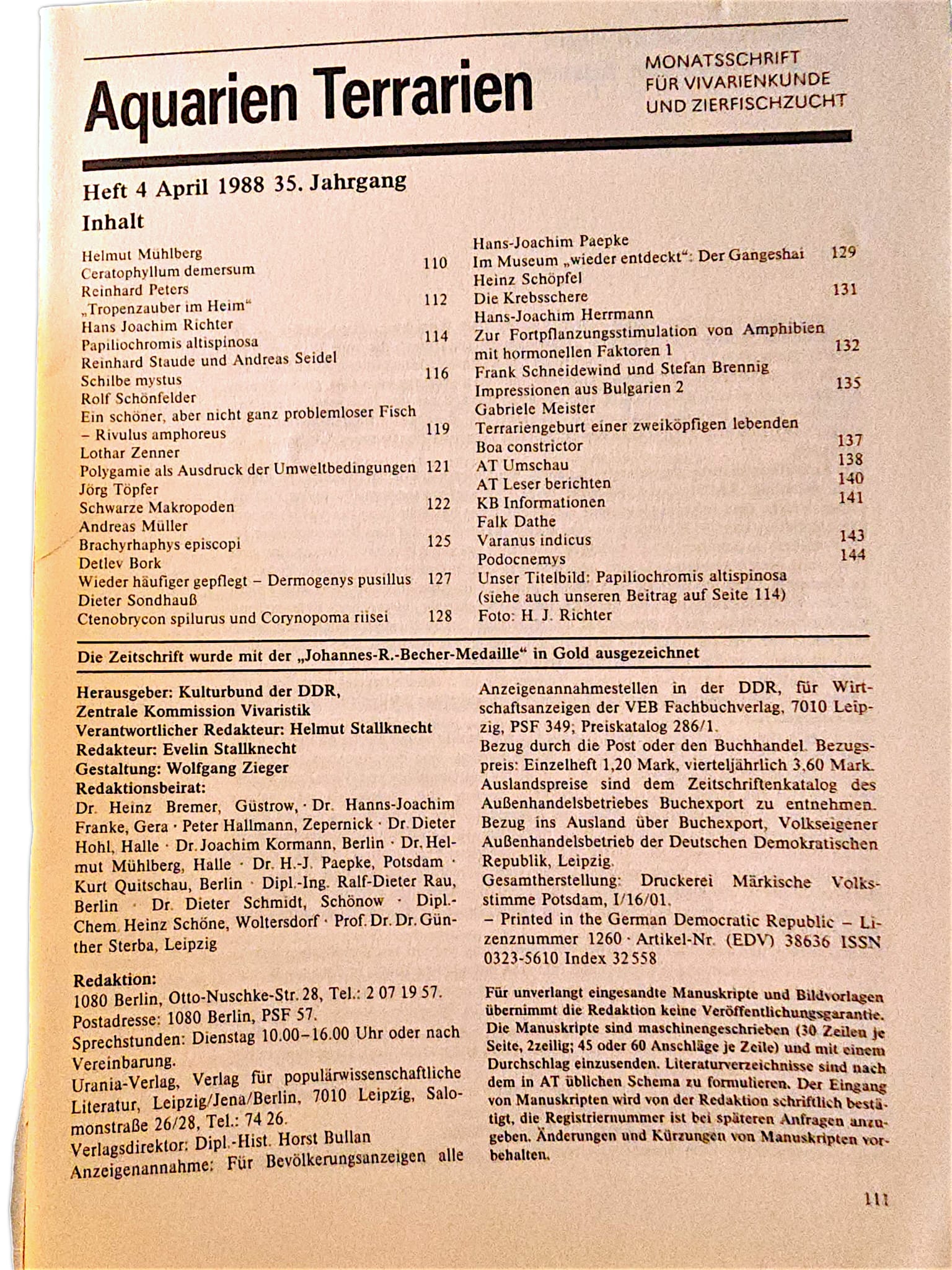 Inhaltsverzeichnis der Monatszeitschrift für Vivarienkunde und Zierfischzucht 4|88