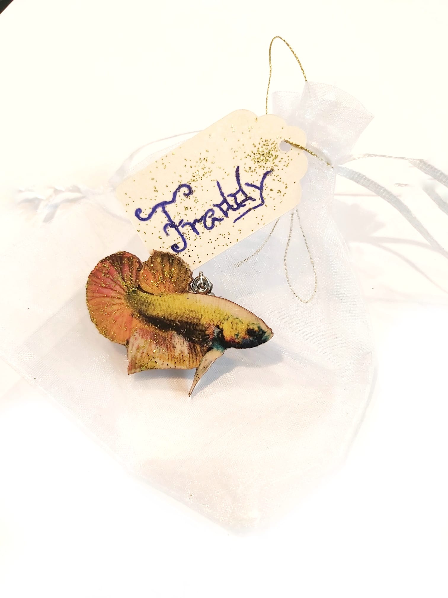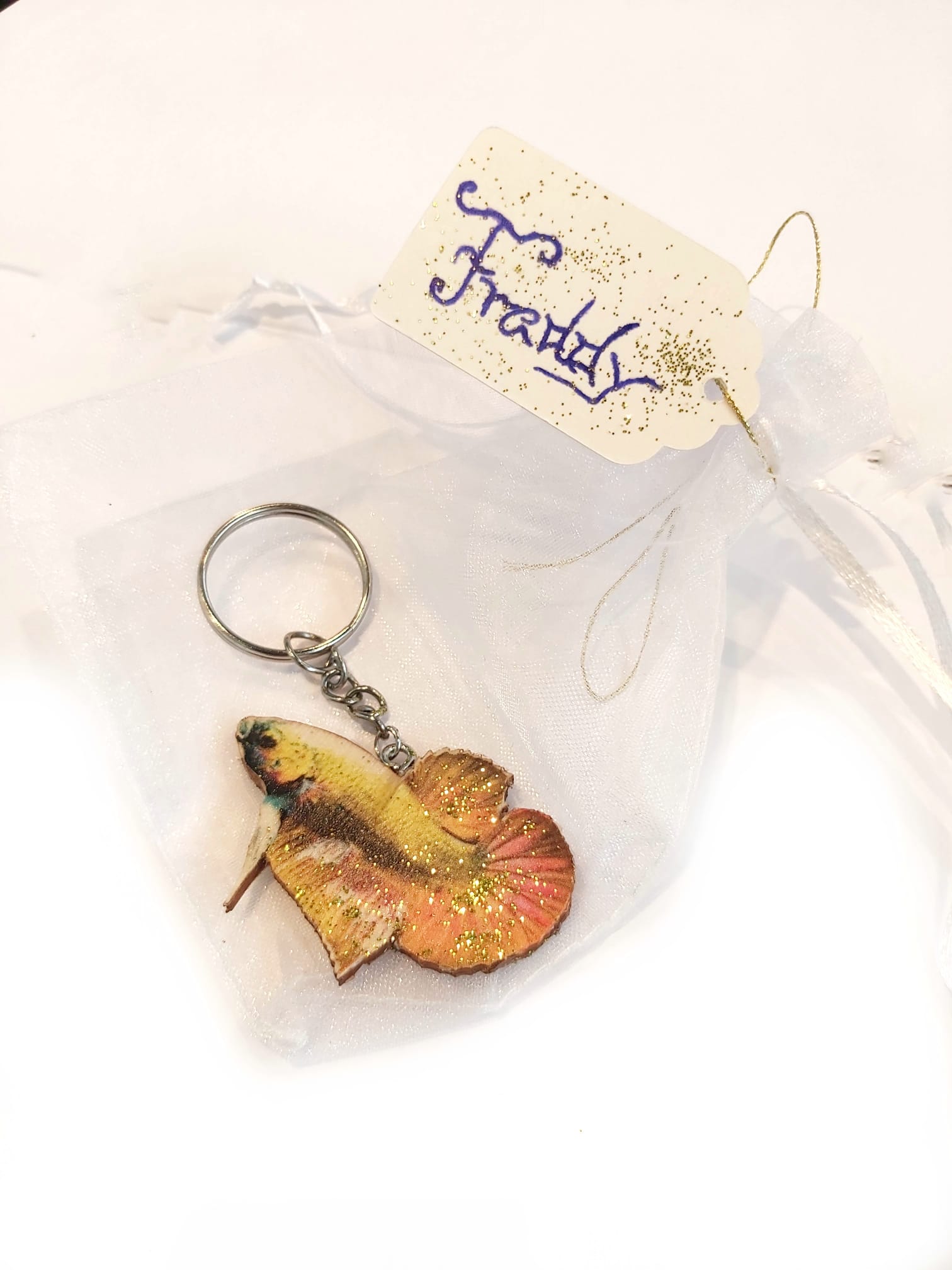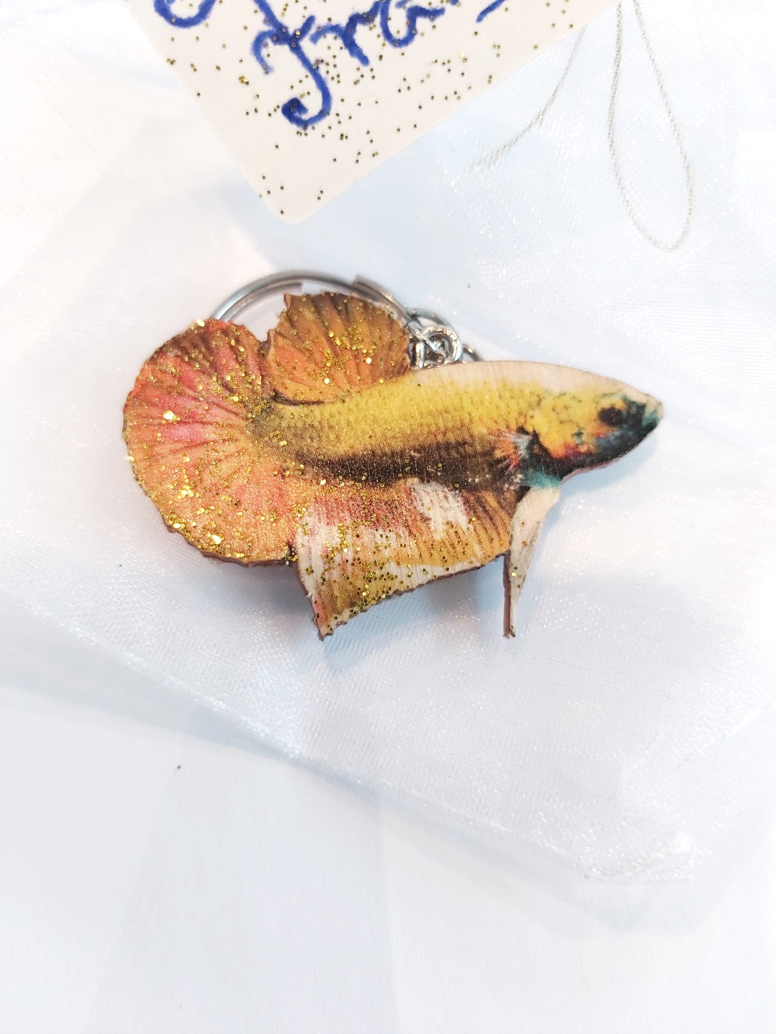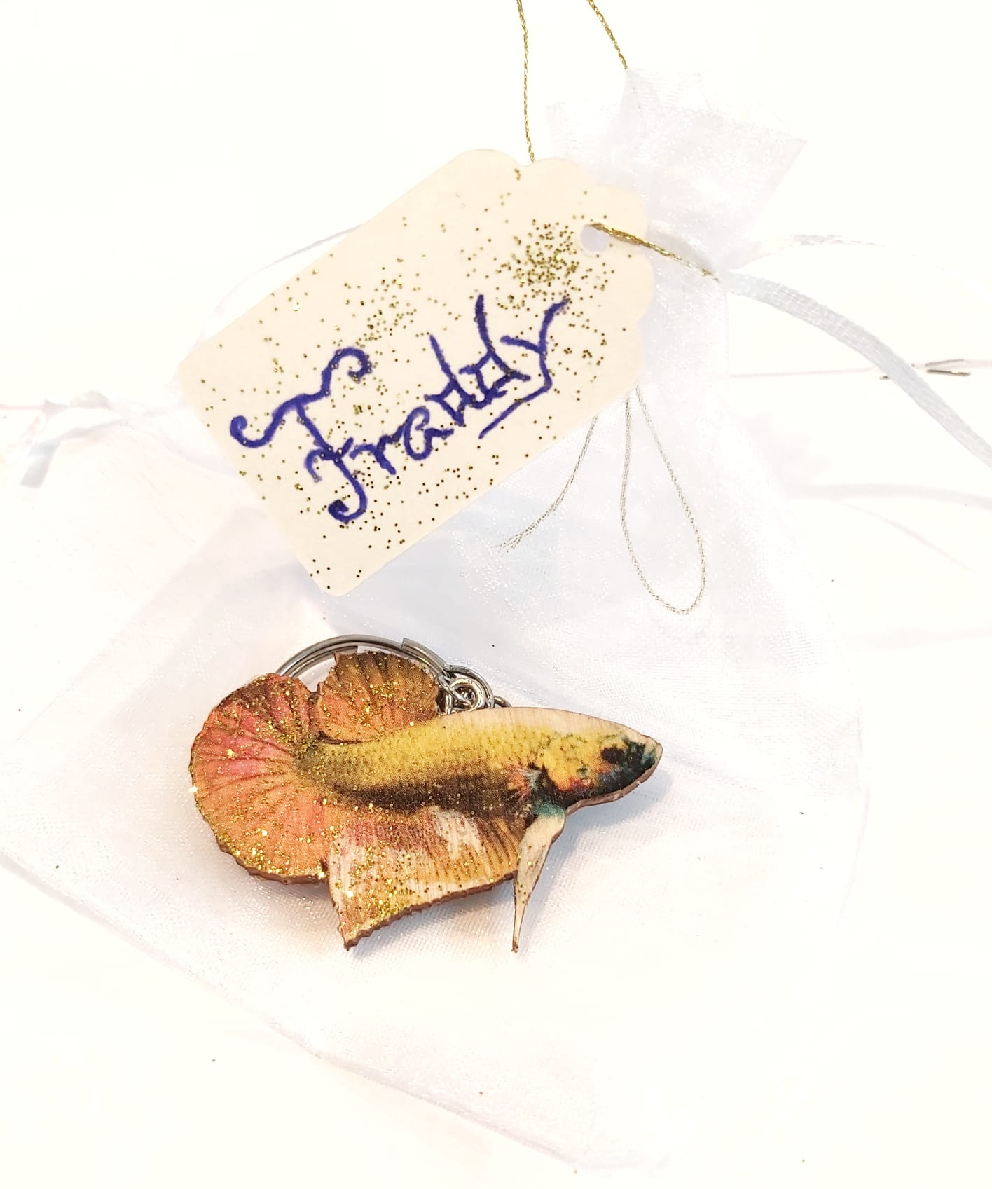 Betta Freddy ist ein kleiner Holz Kampffisch mit einer goldenen Farbe und Glitzer Pigmenten. Er hat ist ein ausgebildeter Schlüsselanhänger und nur bei uns zu bekommen. Er ist ca. 5cm x 3,5cm groß und kann euch auf jedem Weg begleiten.