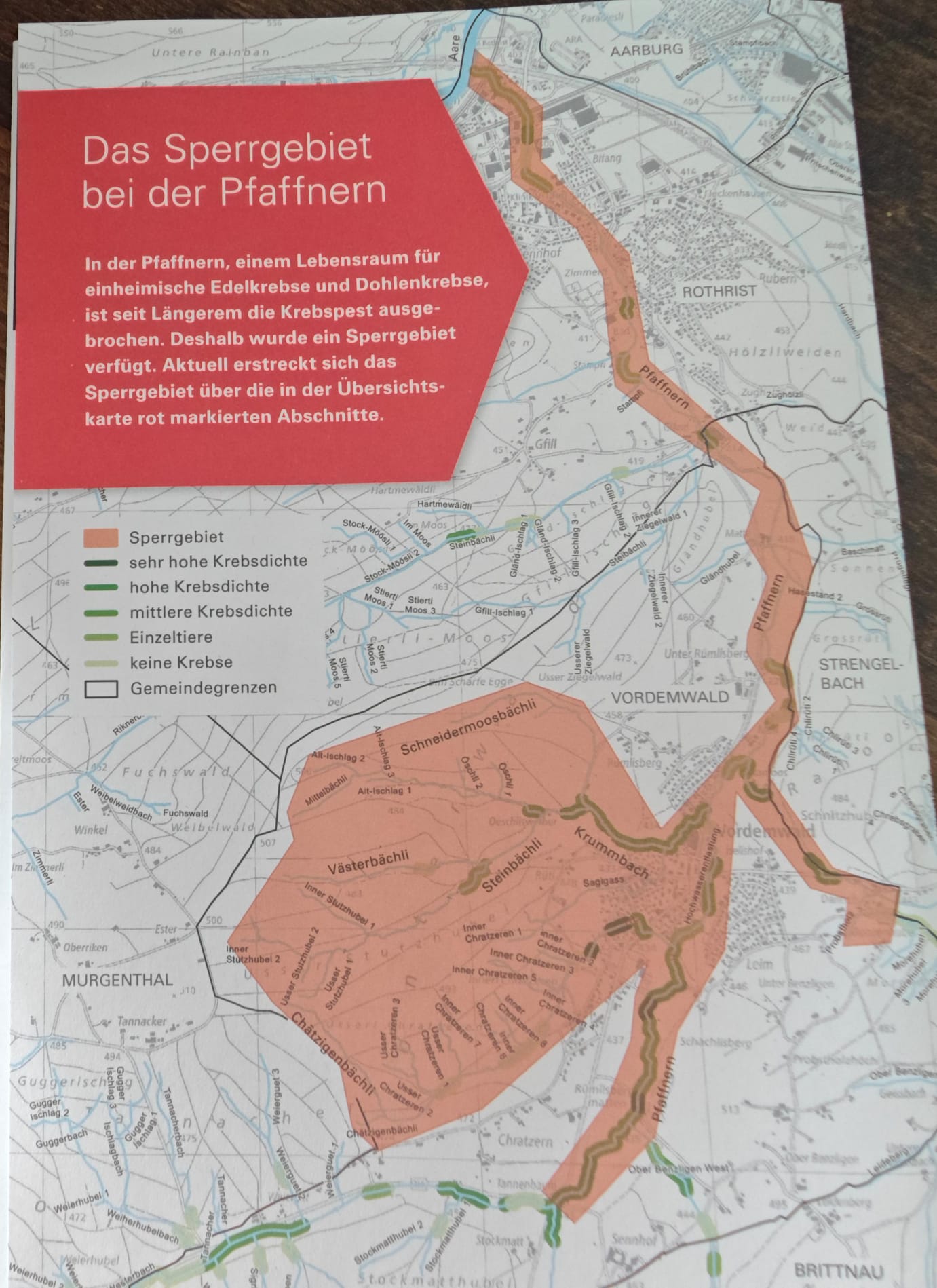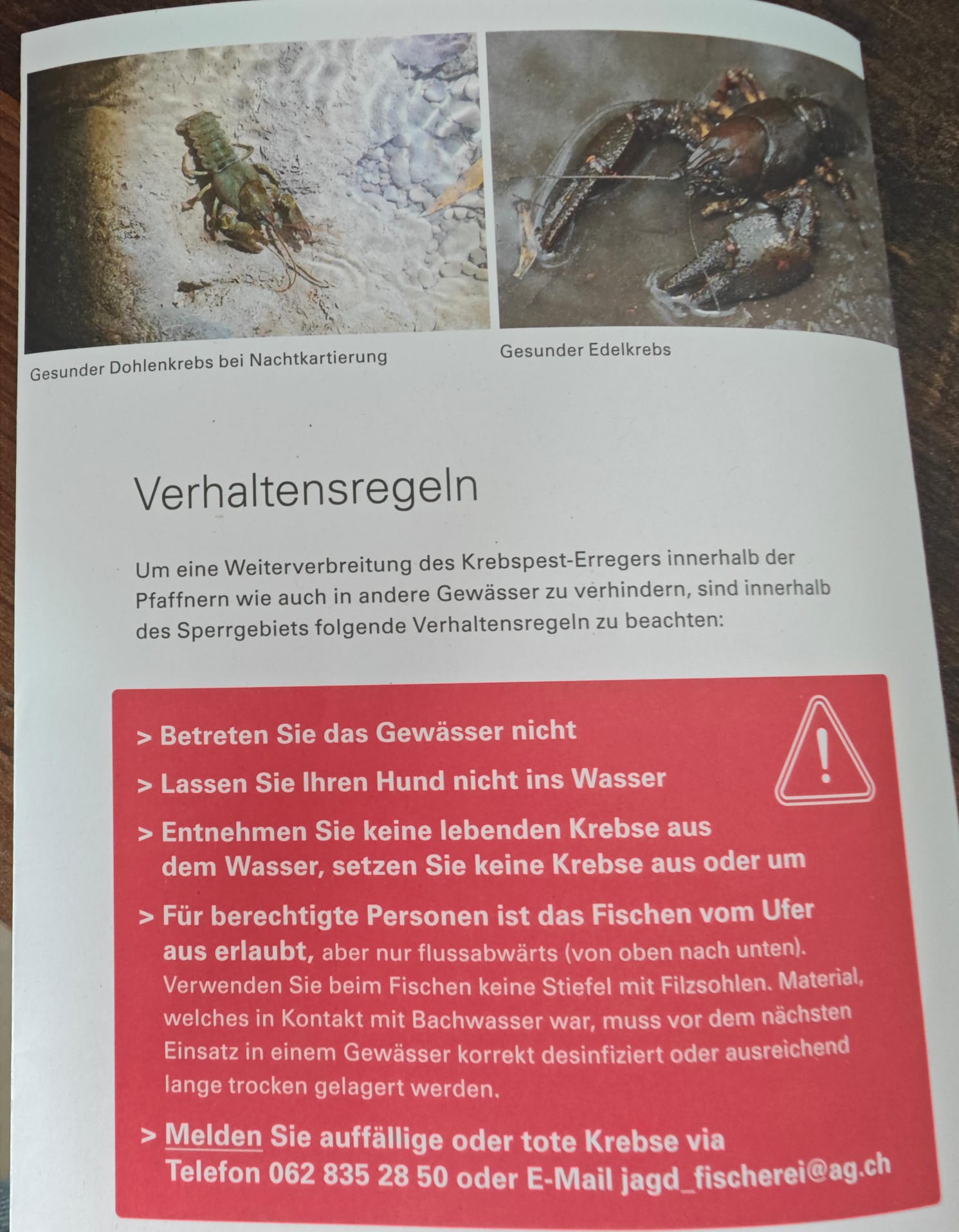 Informieren kann so einfach sein, wenn es nur gewollt ist. Heute erhielten wir einen Flyer der Umweltbehörde im Kanton Aargau. Einfach so im Briefkasten, mit der Information und der Aufschrift: "Helfen Sie mit, die Krebspest einzudämmen".
