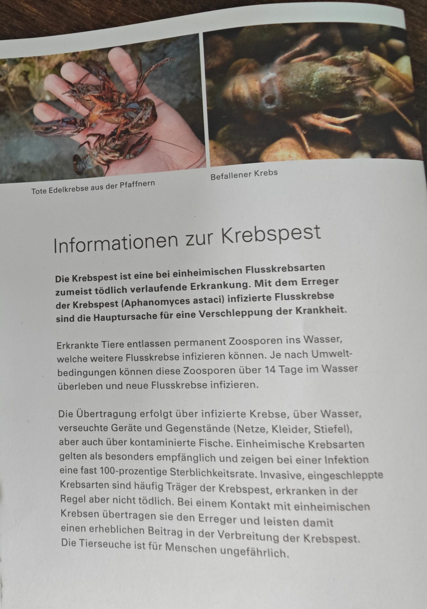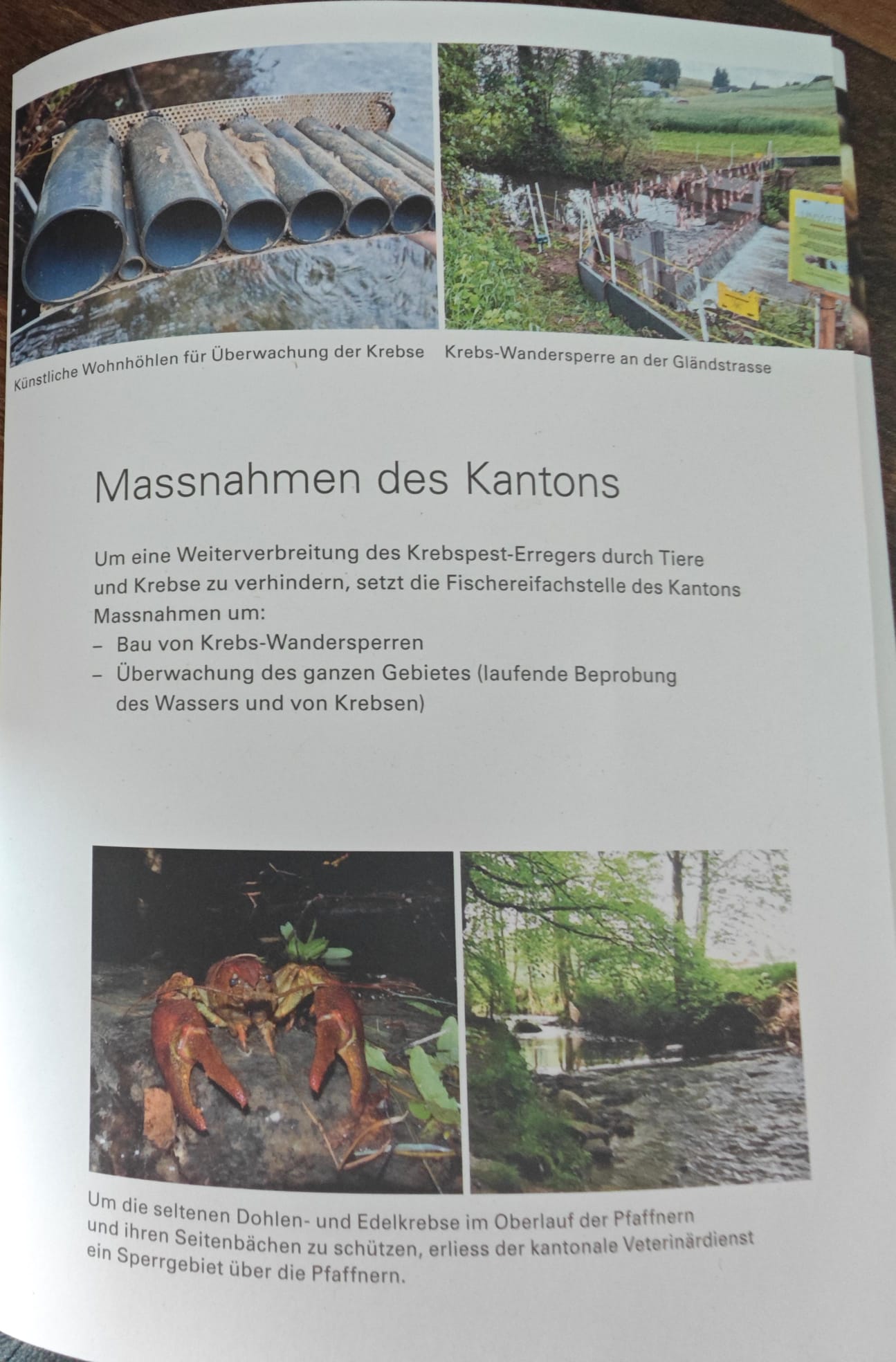 Damit der Erreger der Krebspest nicht weiterverbreitet wird, werden aber nicht nur Flyer verteilt, um die Bevölkerung zu informieren, sondern es werden auch Maßnahmen ergriffen, und das vom Kanton aus.