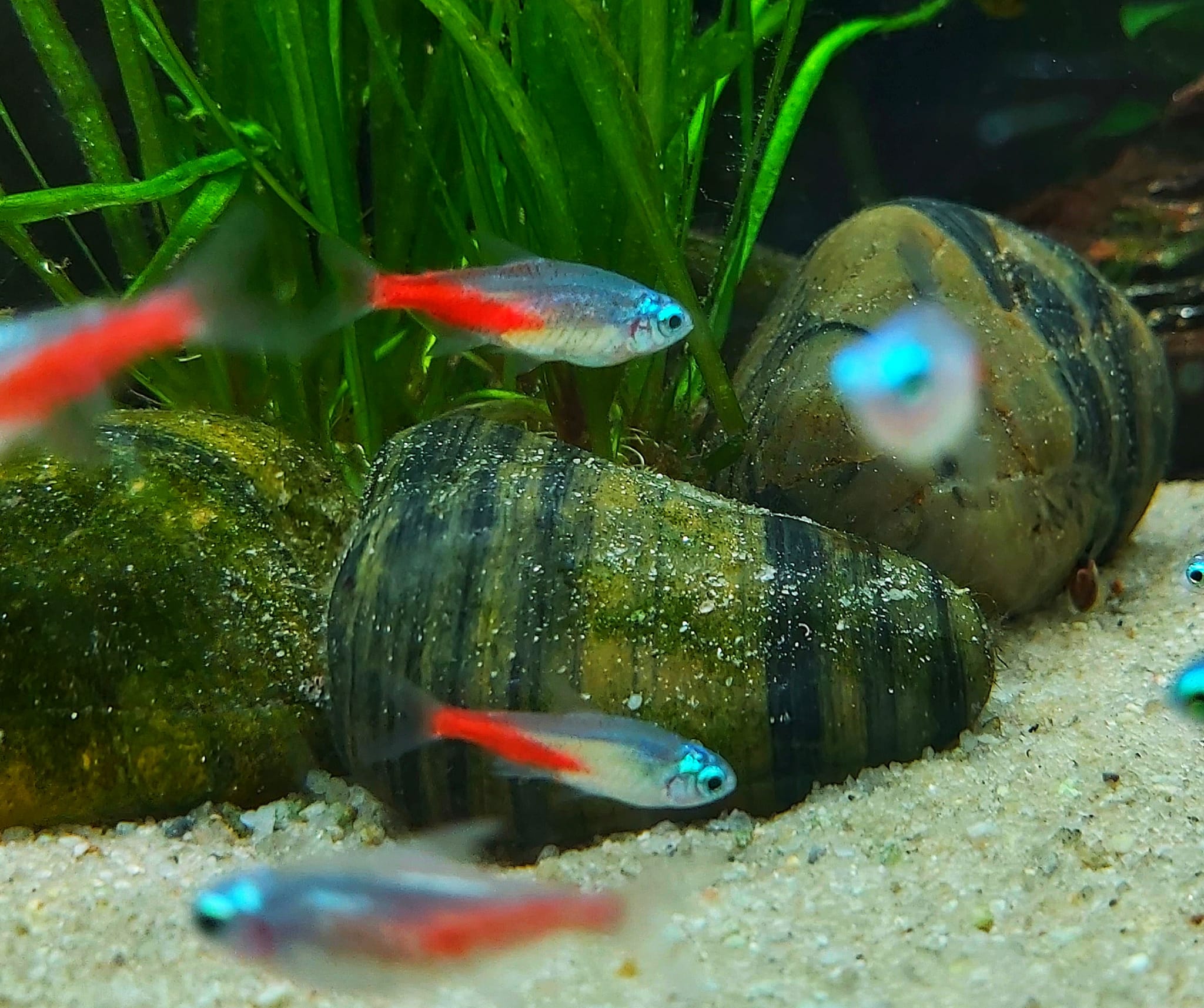 Das Aquarium für Neonsalmler sollte freie Schwimmfläche aber auch ausreichend dichte Bepflanzung haben. Der Bodengrund spielt nur bedingt eine Rolle, er sollte zu mindesten nicht zu grob oder scharfkantig sein, da die Tiere sich häufig am Boden zum schlafen legen. Aber im allgemeinen bleibt euch da die Wahl überlassen.