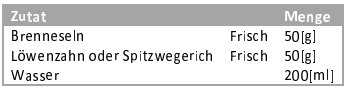 Brennnessel entstielen und nur die Blätter verwenden, dann den Löwenzahn oder Spitzwegerich (oder beides) mit 200ml Wasser pürieren.