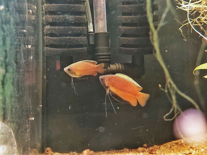 Honigguramis gehören zu den Labyrinthfischen und bauen damit ein Schaumnest. Die Männchen betreiben bis zum Schlupf Nestwache, danach sind die Larven auf sich gestellt.