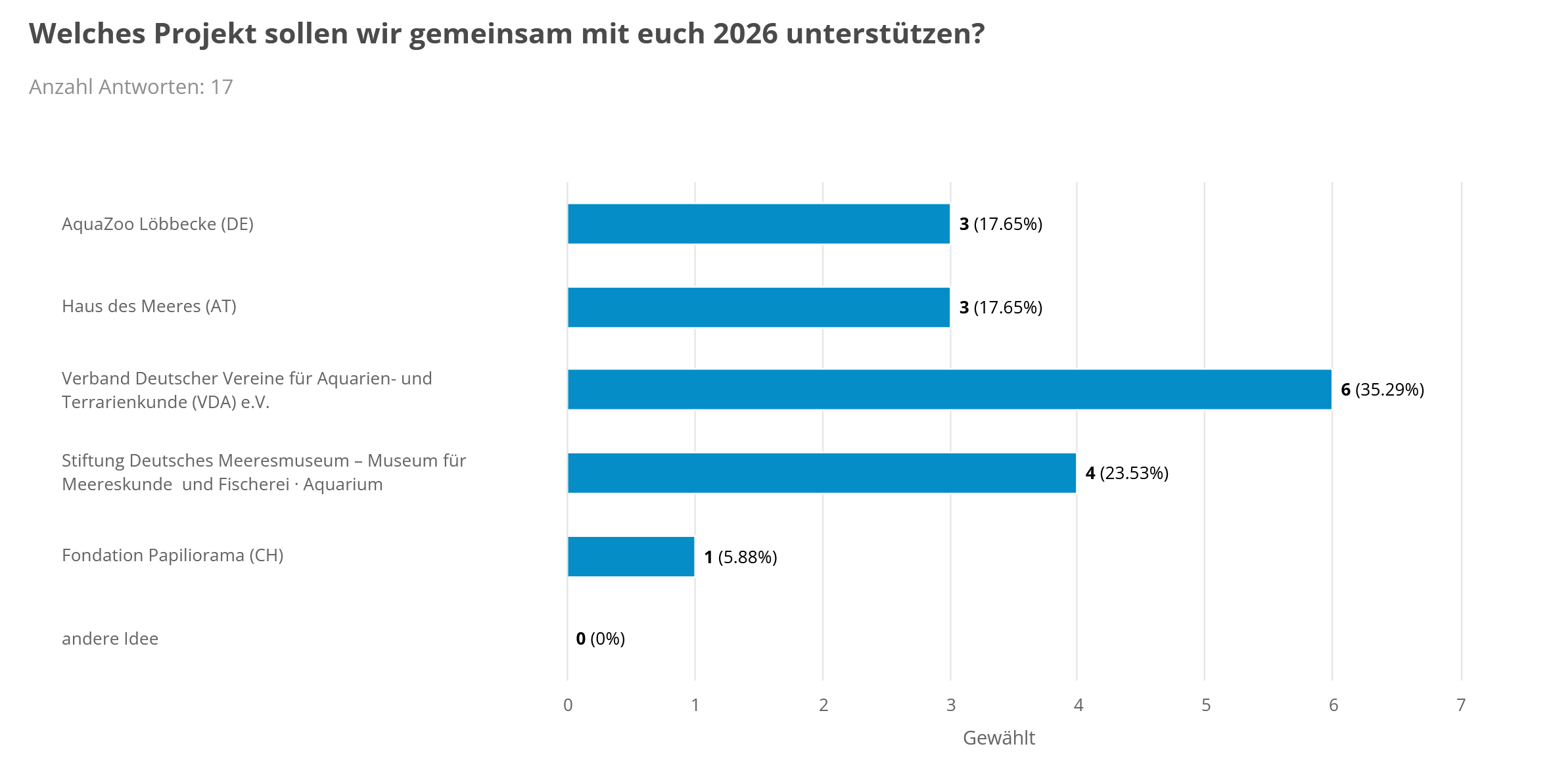 Alle Projekte, die wir unterstützen, haben etwas mit der Erhaltung und Zucht von verschiedenen Zierfischen, Fischen, Regenwäldern, Reptilien und Meerestieren zu tun. Ihr entscheidet also mit, wo die gemeinsame Spende nächstes Jahr hingehen soll. Zucht und Arterhaltung von Zierfischen und Reptilien (AquaZoo und Haus des Meeres). Schutz und Erhaltung von tropischen Lebensräumen und europäischen Arten (Papilorama). Unterstützung im Erhalt des Hobbys der Aquaristik und Terraristik (VDA). Oder die weitere Forschung und der Schutz der Meere und Ostsee über die Stiftung Deutsches Meeresmuseum. Andere Ideen auch gern willkommen, wenn sie mit dem Bereich der Arterhaltung und Aquaristik/Meere oder Terraristik zu tun haben.